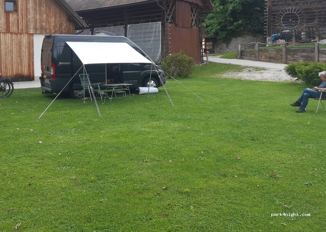 Sitio precioso, tipico esloveno. Nos dejo dormir debajo del granero y con toma de corriente. Muy agradables y todo super tranquilo. Un 10 de sitio. Si llegas y no les ves… pica en las casas que a veces no se dan cuenta de que has llegado. Nos cobraron 15€.