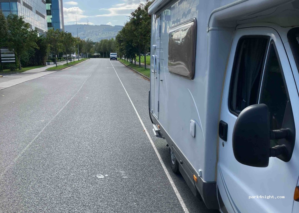 Roadside parking with no bay length. 8h-19h monday to saturday pay and display. Nothing says no overnights. Lots of private business parking so CCTV everywhere.
