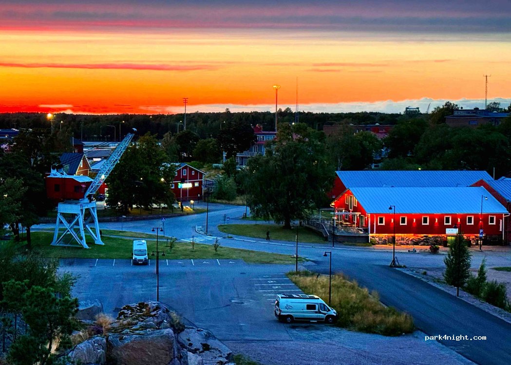 Ein Stellplatz auf Asphalt,oder daneben auf Schotter mit besserer Aussicht auf Hafen bzw. Schären. Im Umfeld gibt's viele Neubauten.Toller Aussichtsturm oberhalb der Stellplätze. Diverse Restaurants im direkten Umfeld. Entsorgung gegenüber im Yachtafen möglich.0,00 € !
