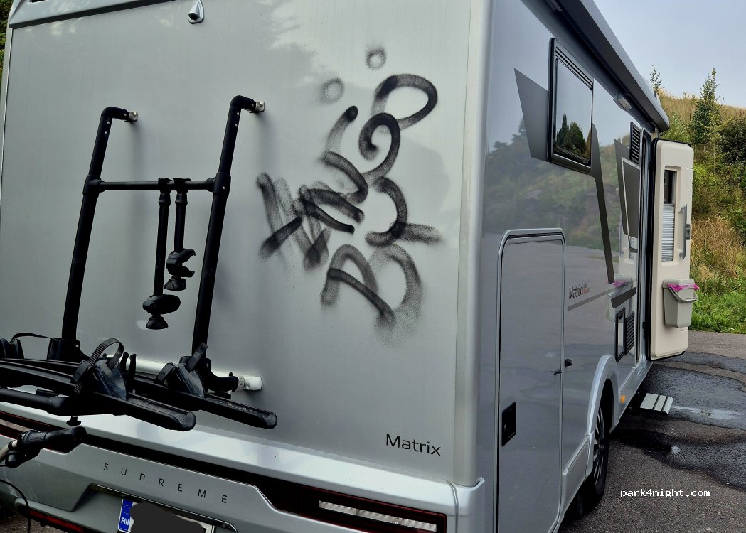 Yön aikana oli asuntoautomme takaseinään maalattu graffiti. Kierrä levoton parkkipaikka kaukaa!