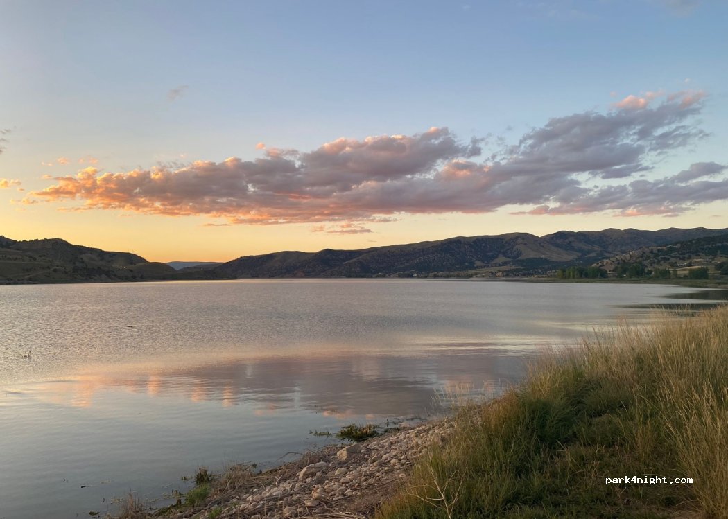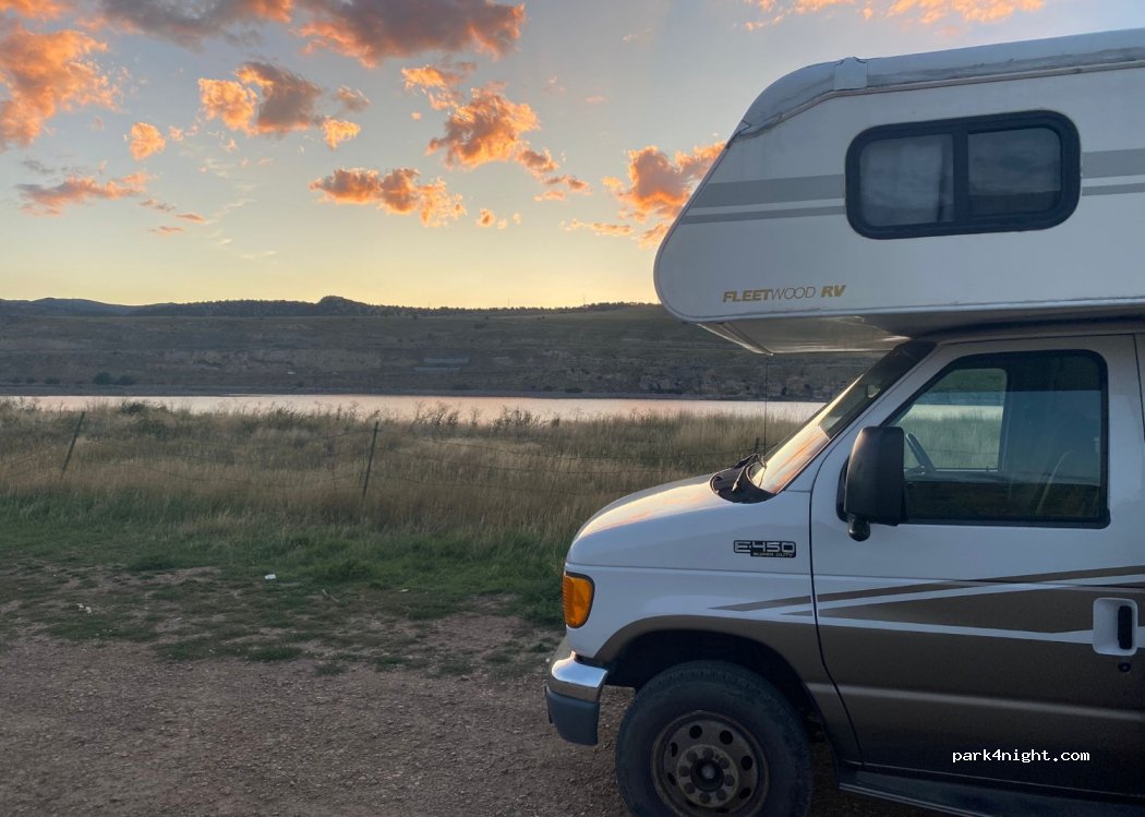 The parking lot is public for local fishermen. There is a sign prohibiting camping on the bank of the reservoir.