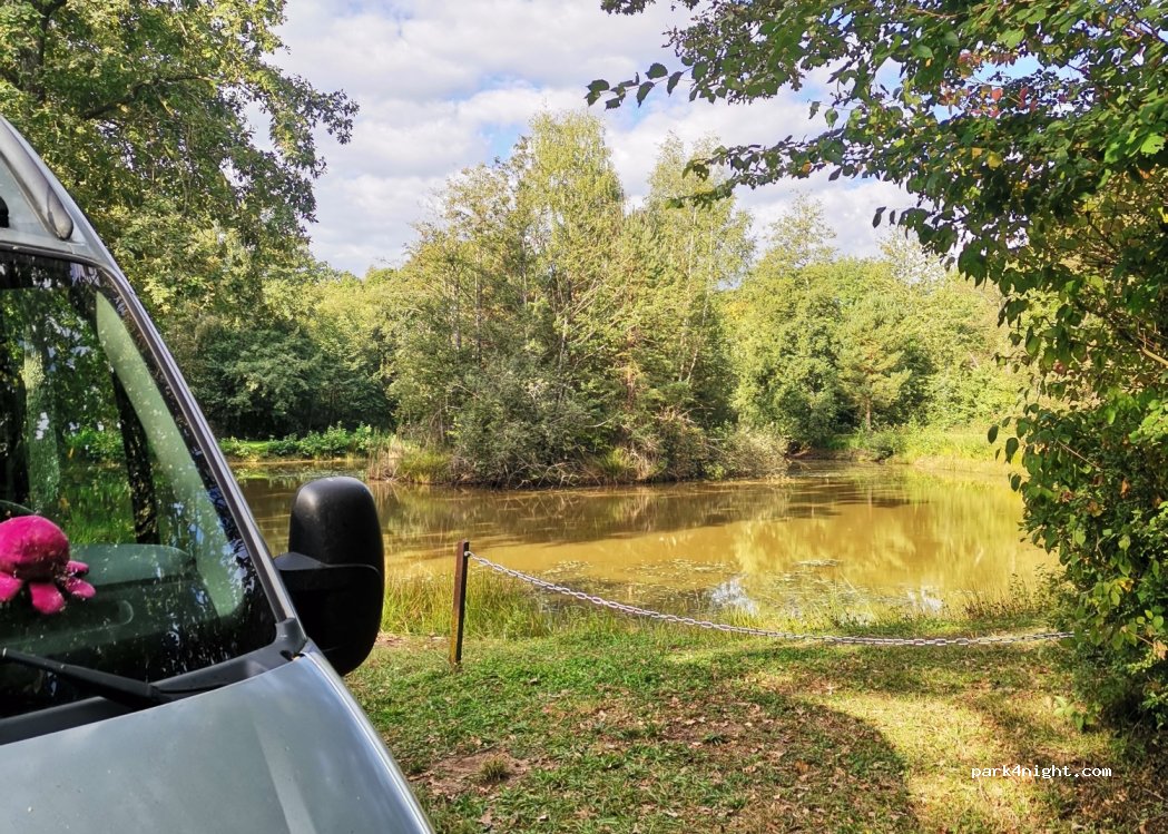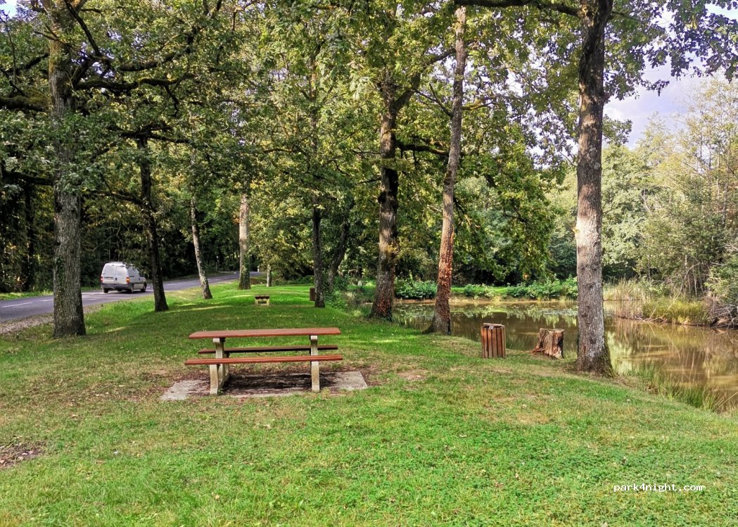 Daytime parking at the edge of a small pond! Ideal to spend the day there! Tables and trash cans are placed all around the pond. And beautiful walks in the woods are possible