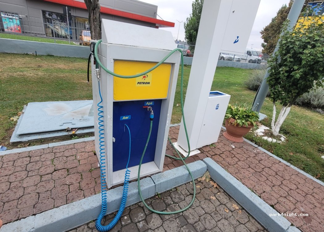 Water (most likely not drinking water quality) with a long hose at the Petrom gas station.