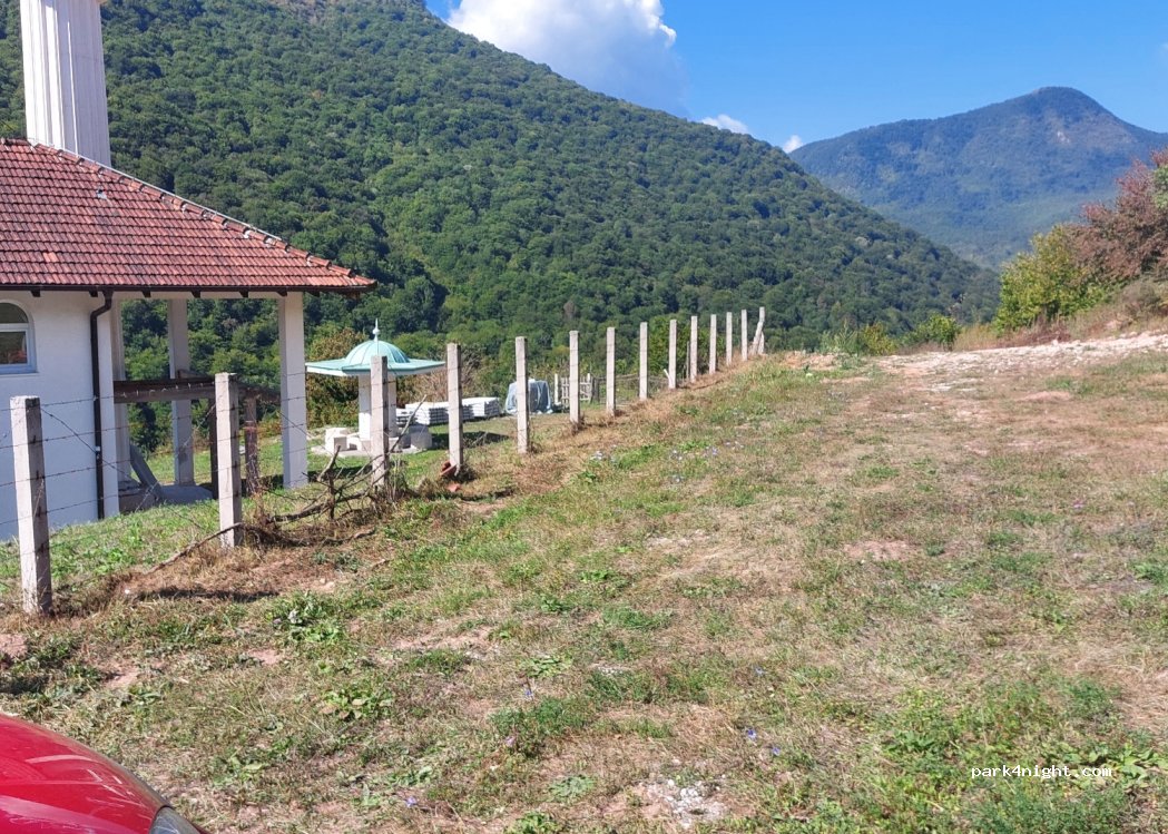 Square on a meadow next to a closed mosque. The journey to the place is short, but at the end it is quite washed out and slippery. But it was still possible with our Ford Galaxy (not a 4x4). You can fill up with water at the mosque and you can sometimes still get some WiFi from the campsite next door. Only the area next to the barbed wire fence is flat, the rest of the meadow is quite sloping