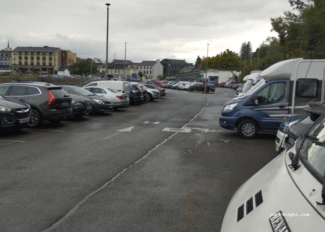 This place is perfect to park any size campervans...right in the centre of Donegal for pubs restaurants and shops...30 cent an hour from 9am until 6pm then free to park overnight...it was quiet too for sleeping through the night