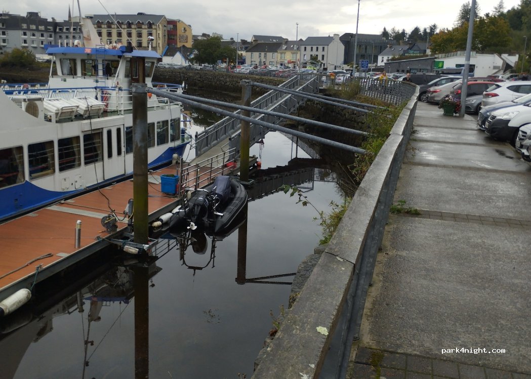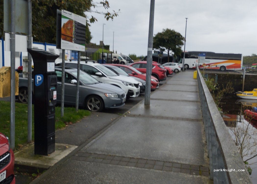 Only cost €1 as arrived around dinner time but 6pm-9am free. Only takes coins (not cards). Flat carpark right next to the waterboat/pier/river. A few campers and buses but plenty of space. Town centre minutes away to walk. Lots of car activity on a Tuesday evening/night. Back and forth, in and out despite a Garda station opposite??? Felt safe enough though.