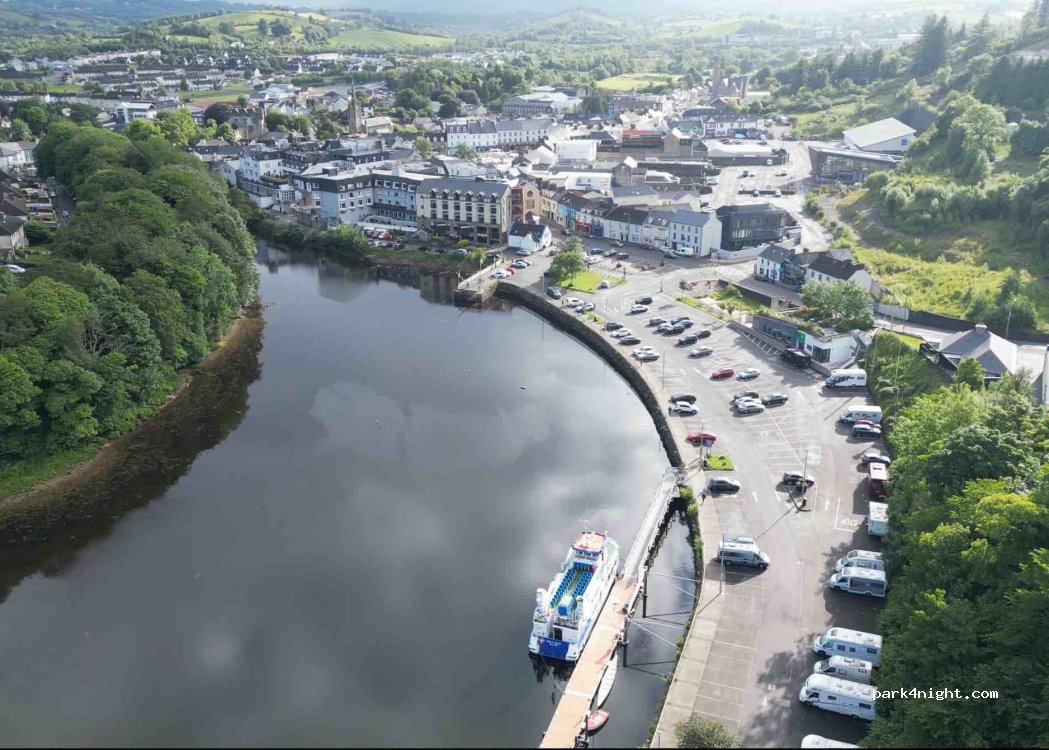 On a wet evening 15 vans were all responsible parked in the Quey Street carpark over looking the river. Tourists office next to carpark and were very helpful. Short walk to centre. Traditional Irish music in two pubs on the evening we were there.