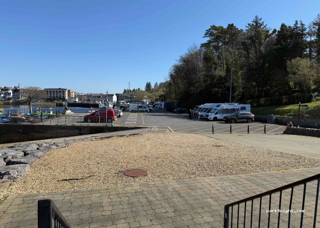 Lots of parking spots for campers at the end of the lot. Several campers and motorhomes around. Parking charges Monday-Saturday 9-6pm very cheap. Great location for accessing Donegal centre.