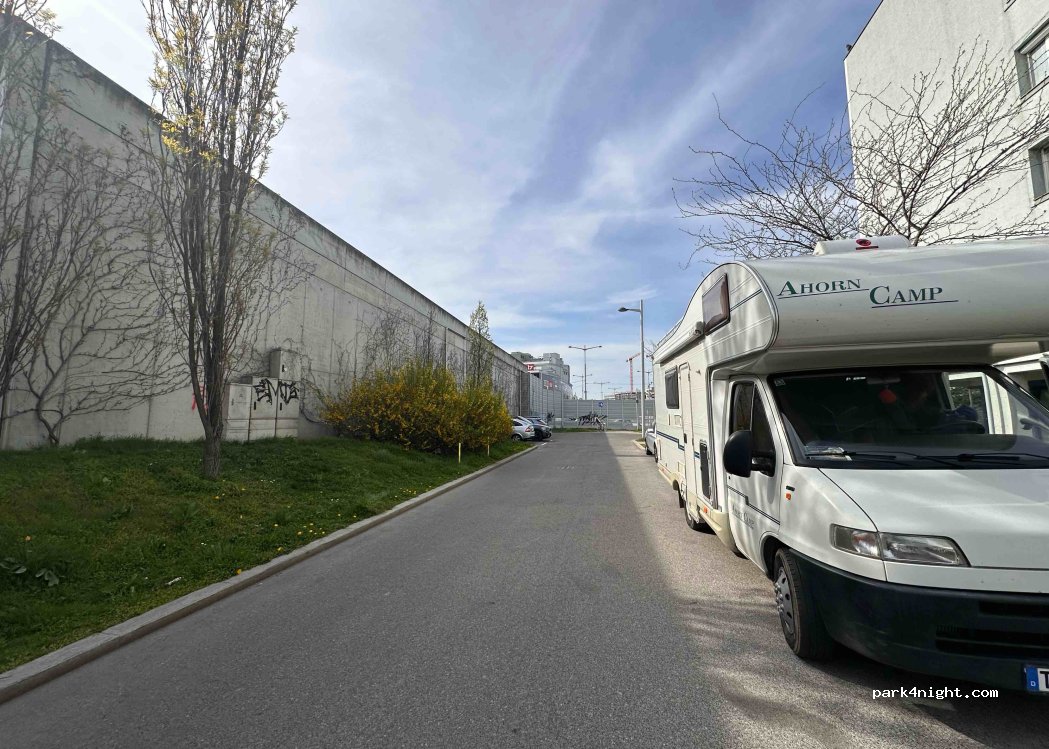 The parking lot is located in a cul-de-sac right next to the exit of the southeast tangent A23 Landstrasse. It is a little noisy, but it is insulated by a noise barrier. Monday to Friday from 9:00 a.m. to 10:00 p.m. Maximum parking time: 2 hours, Saturday and Sunday free. There is a park around the corner with a riding arena.