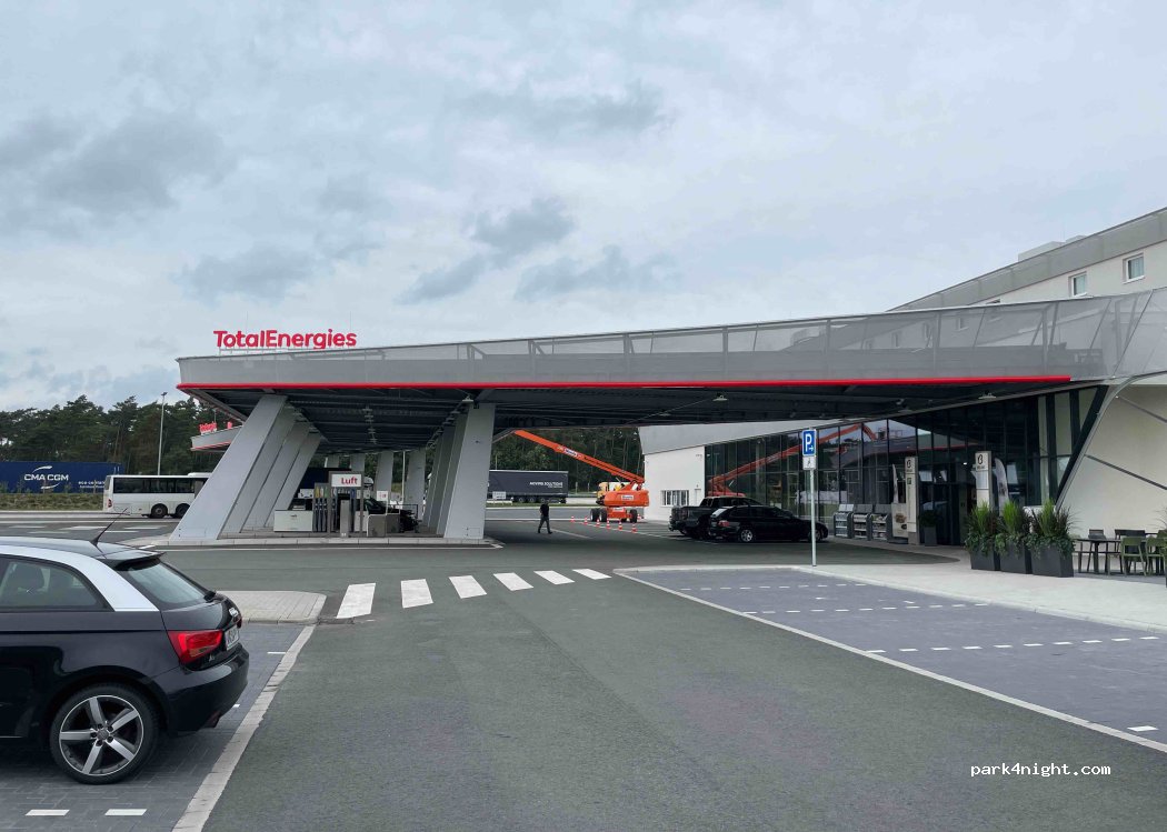 Free RV parking behind the main building. Clean showers (3 Euro for 7 minutes). Gas prices lower than directly on the Autobahn. Free greywater draining, paid cassette cleaning and paid water faucet available (see extra entry here on P4N) Main building has a micro brewery well worth a visit, restaurant, convenience store and even a chain hotel.