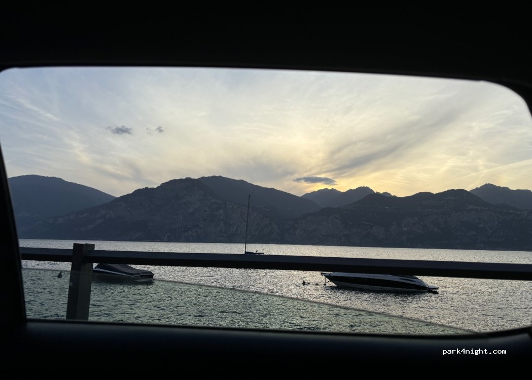 Bel parcheggio in riva al lago proprio sull'acqua. Dall'altro lato c'è la strada, che di notte è relativamente tranquilla. Il parcheggio qui costa solo dalle 9:00 alle 20:00 e il pernottamento è gratuito. L'altezza del veicolo non deve però superare 1,90 metri, quindi questo parcheggio non è adatto ai camper, ma è adatto per i furgoni più piccoli e le auto notturne perché anche i posti auto sono piuttosto piccoli. Tuttavia, abbiamo anche visto qualcuno che ha semplicemente spinto via la barriera dell'altezza, quindi se hai il coraggio, puoi aggirare il limite di altezza. La vista sul lago è davvero molto bella.