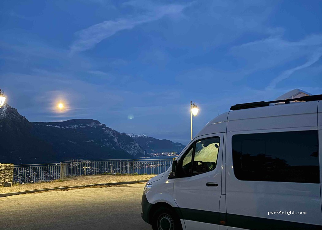 Der Parkplatz liegt abseits, ein wenig oberhalb der Stadt. Wir hatten den besten Platz der Fläche mit toller Aussicht. Der Platz ist soweit wir wissen kostenpflichtig zwischen 7-20 Uhr und über App abwickelbar. nur zu empfehlen, sehr ruhig !