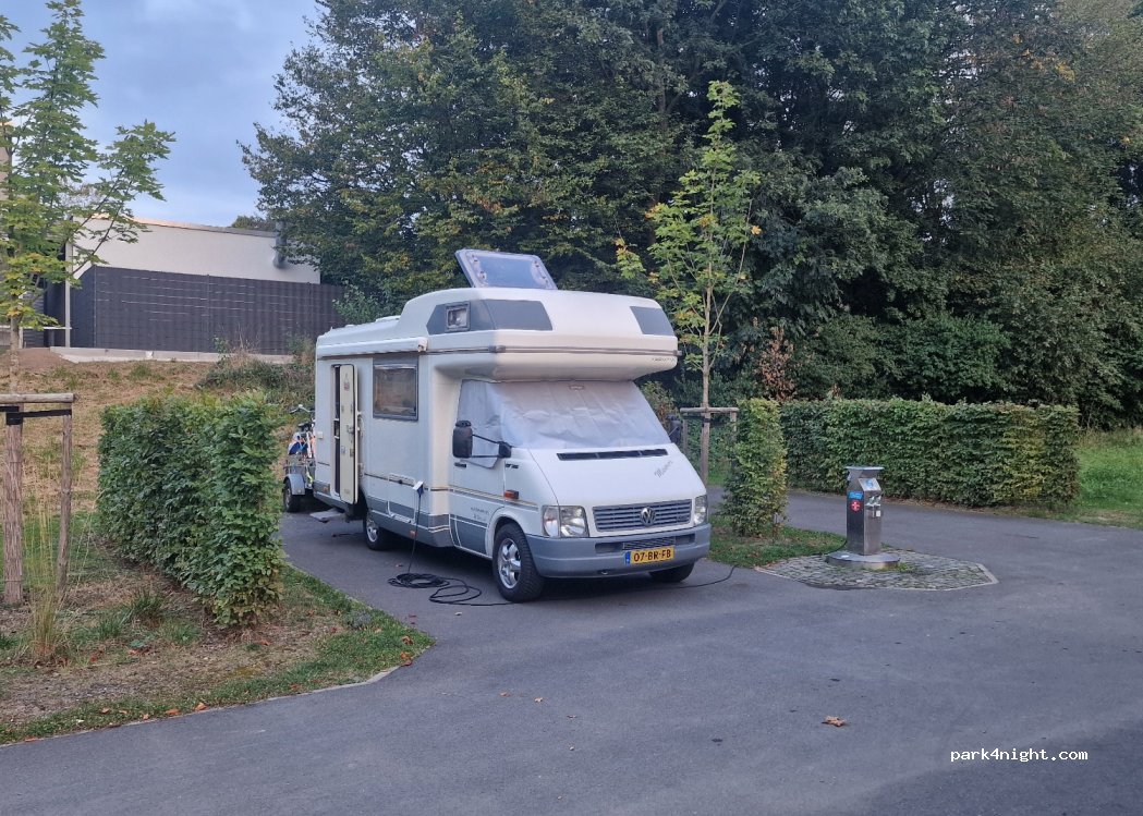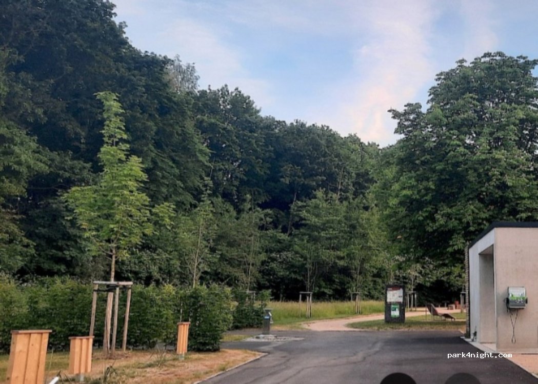 Supply and waste disposal facilities, chemical disposal, and charging stations for e-bikes and electric cars. Parking spaces are located in a well-maintained green area with seating and an exercise course. Payment is via the Parkster app.
