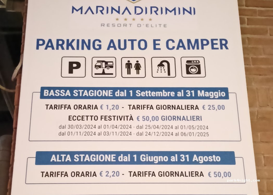 Arrivato di sabato sera. Si entra prendendo il biglietto alla sbarra, poi si va negli uffici della Marina di Rimini per ritirare la chiave per le docce e per attivare la corrente 220V. I costi €2,40 ora altrimenti 50€ 24h in agosto. Direttamente sulla spiaggia ma senza ombra. Posto poco affollato, ristorante vicino, carico e 220V in piazzola, scarico grigie/nere vicino all’entrata. Tutto sommato ci siamo trovati bene peccato per l’ombra.