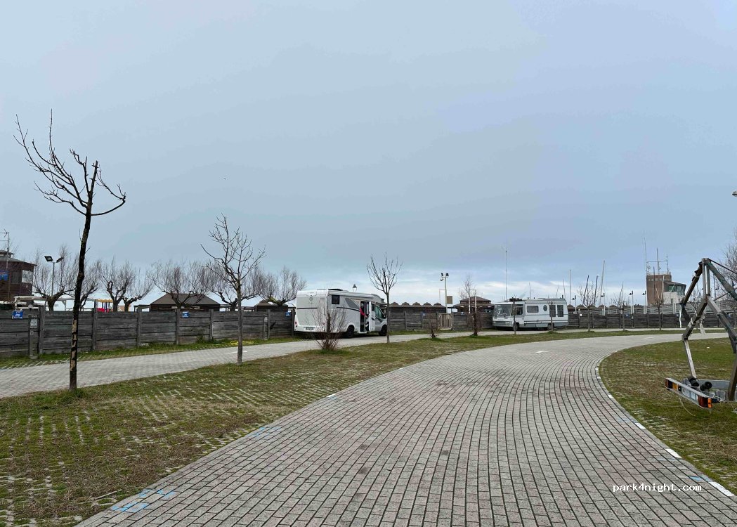 Area di sosta a pagamento. È segnalata la presenza di servizi ma sono in realtà quelli della Marina, che richiedono di avere un pass per l’ingresso ma non è specificato da nessuna parte dove ottenerlo. Quando siamo stati noi non c’era nessuno nemmeno alla reception quindi non c’è stato modo di richiederlo