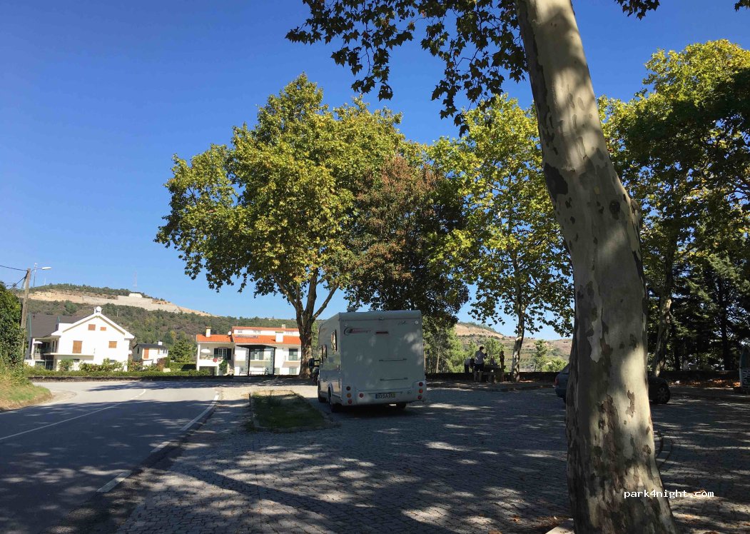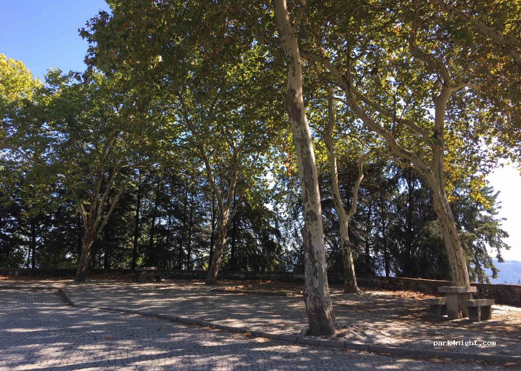 Tree stone picnic tables+seats under big trees, with view to deep Corgo river valley and A4 highway long bridge. Bar/restaurant nearby.