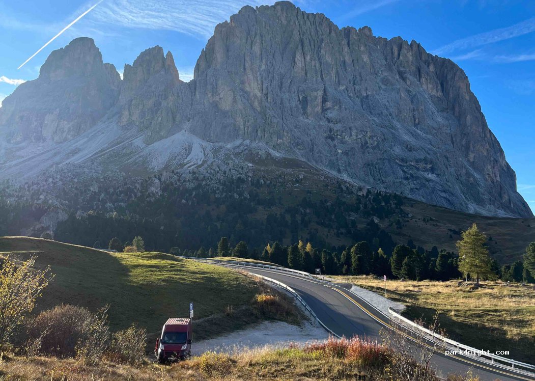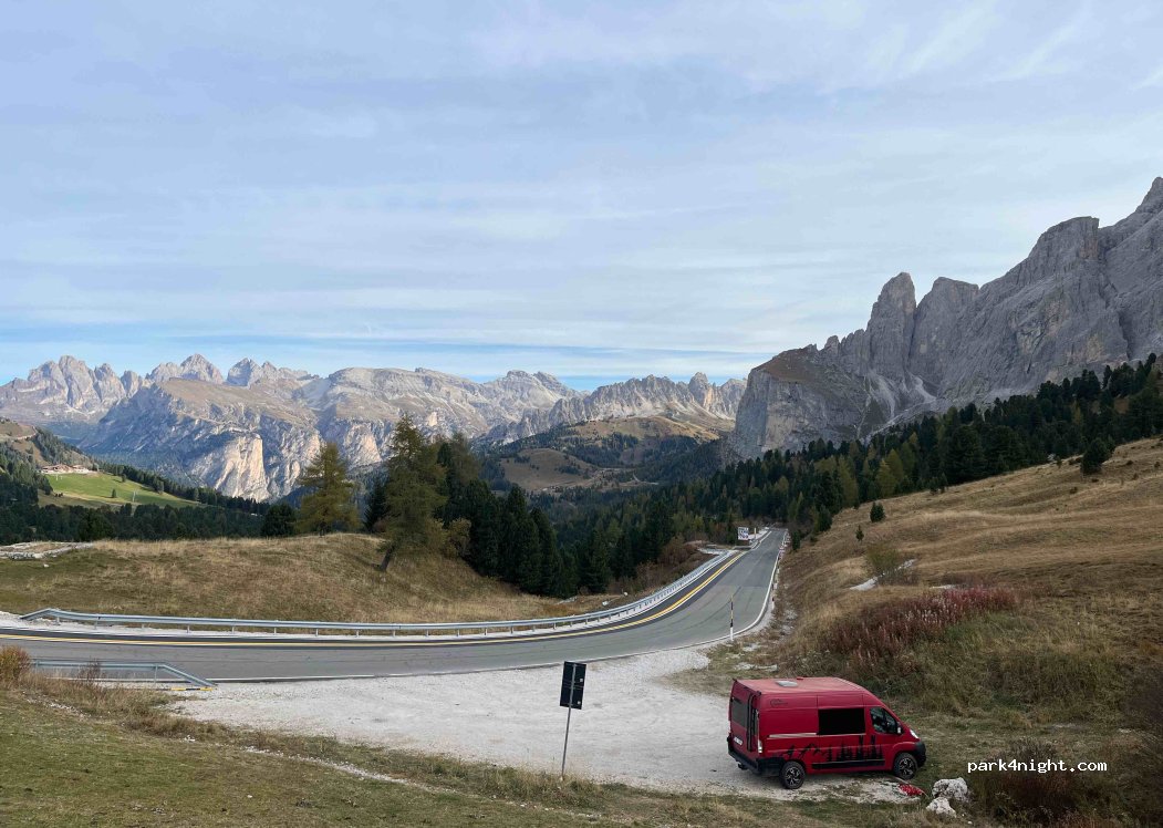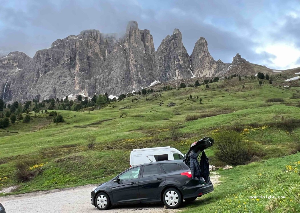 Parking on the roadside towards the Sella pass with a splendid view of the Sassolungo! Good alternative to other spots that are always full or have a fee. Fairly flat and suitable for 5/6 vans or campers. Stream next door (not drinkable). Super view!