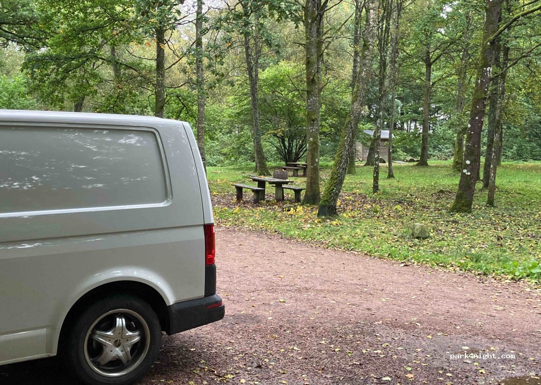 Laut Beschilderung ist es hier verboten, Wohnwagen und Wohnmobile abzustellen. Für eine Rast ist dieser Platz aber schön. Ich werde weiterfahren, bevor ich 600 Kronen zahlen muss für unerlaubtes Camping. 3 Minuten weiter ist ein großer Parkplatz ohne Beschränkungen.