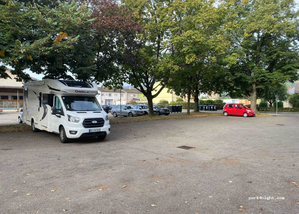öffentlicher Parkplatz ( nur Wochenmarkt am Freitag). Nachts ruhig, in der Nähe einer Schule. Haben dort eine problemlose Nacht verbracht. In der Nähe gibt es ein gut bürgerliches Lokal ( nennt sich der Stall ) mit frisch zubereitetem Essen und nicht teuer.