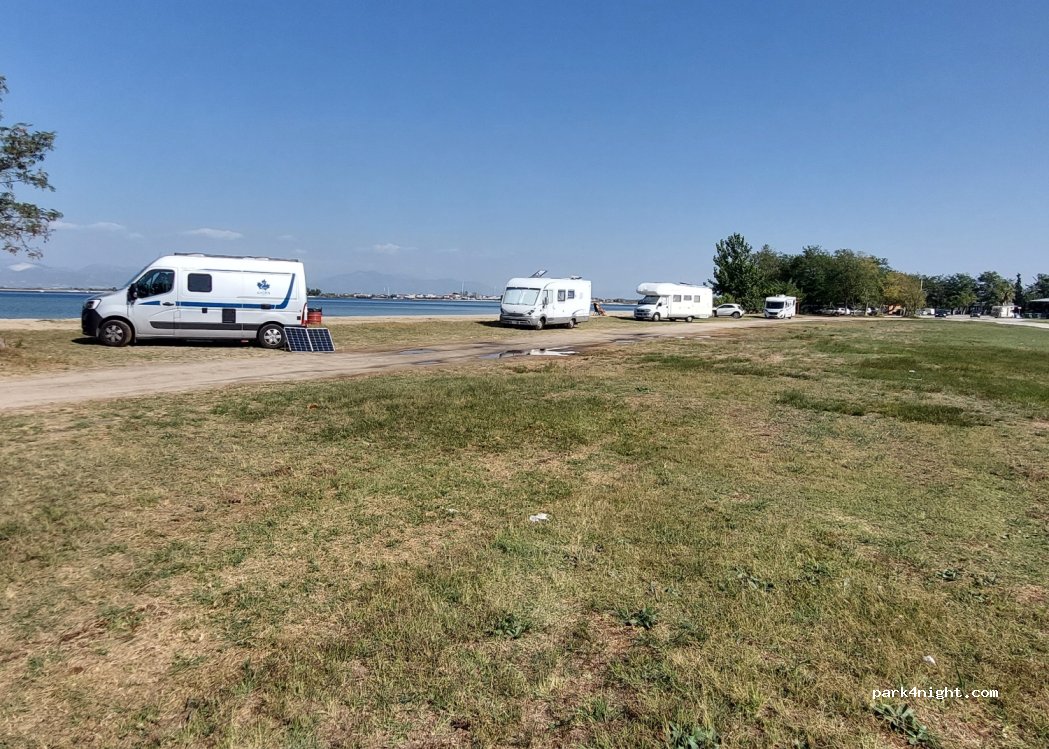 A nice spot next to the shallow beach with a few campervans, quiet nights. Ferry to and from Thasos nearby. It is perhaps a place tolerated for an off season stay as the nearby camp is closed. Walking a few minutes to Keramoti and the restaurant(s). The entire peninsula is surrounded with a fine sandy beach.