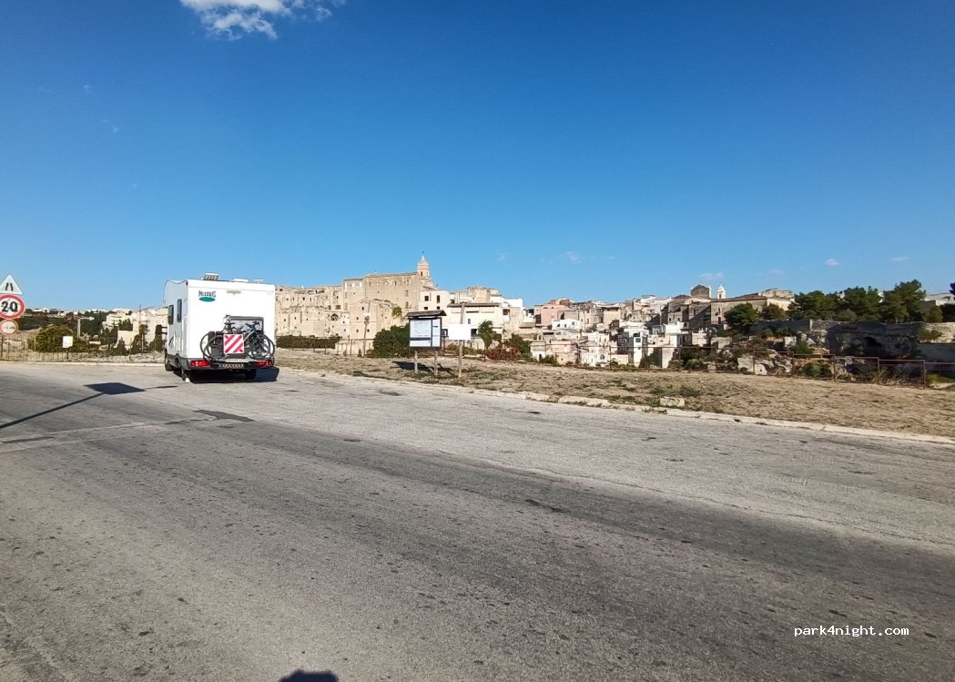 Parking sur le bord de la route un peu en pente, bruyant de jour, mais calme après 22h. Très belle vue sur Gravina in Puglia et sur le Ponte Acquedotto sul torrente Gravina. Le pont et la ville sont accessibles à pied en longeant la route sur 300m. Aucune interdiction.