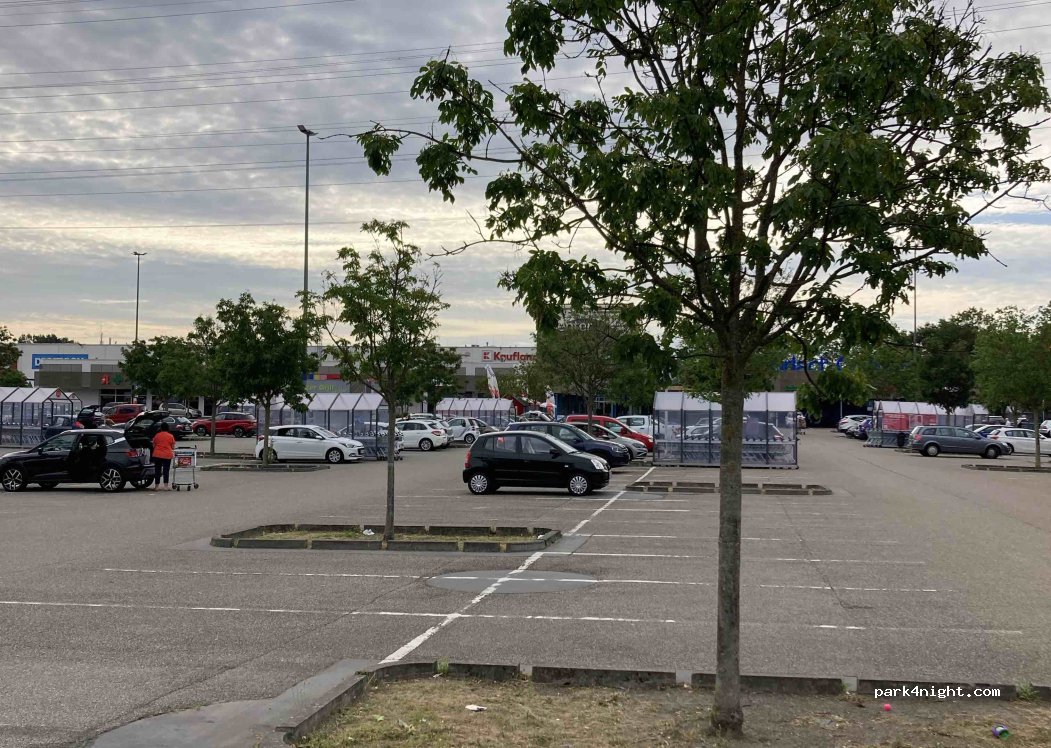 Einkaufszentrum mit Tankstelle direkt in der Nähe der Autobahn. Keine Parkscheibe. Übernachtung nicht erlaubt.