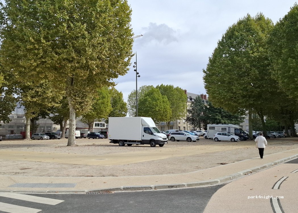 Très grand parking avec de jolies places à l'ombre. Interdit pour les camping-cars de 22h à 8h mais idéal pour visiter la ville. 5 mn à pied avec la jolie vue sur le château en traversant le pont