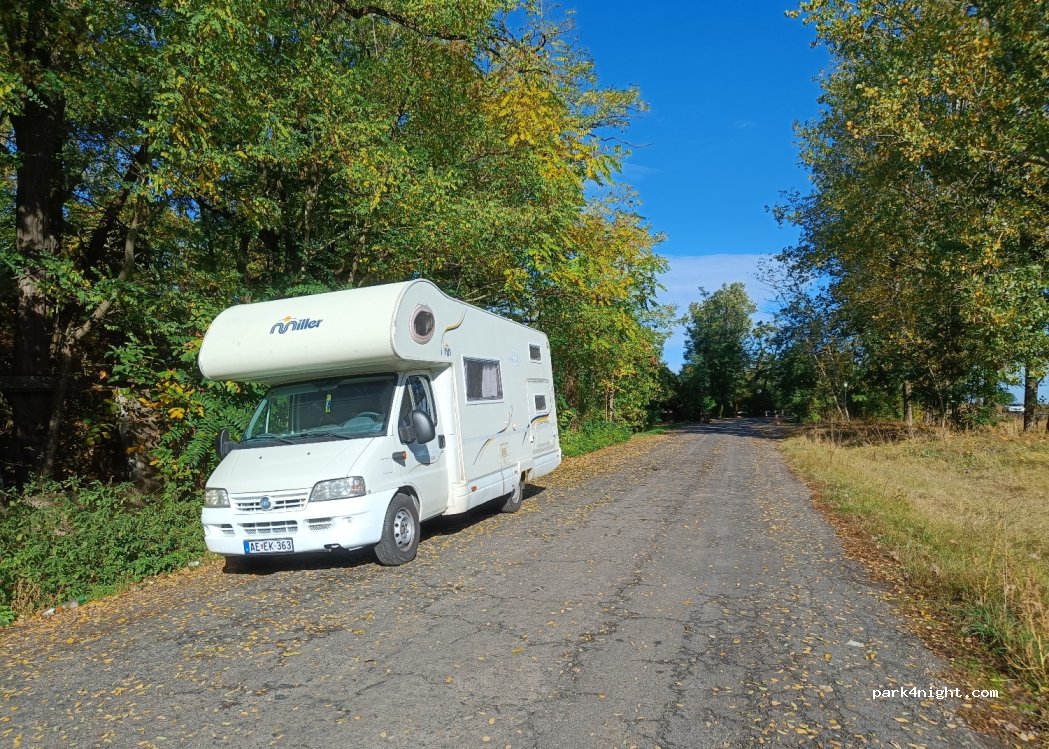 Es liegt direkt an der Straße und bietet Platz für mehrere Wohnmobile.