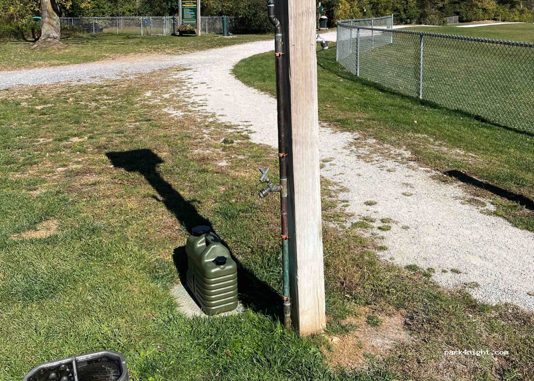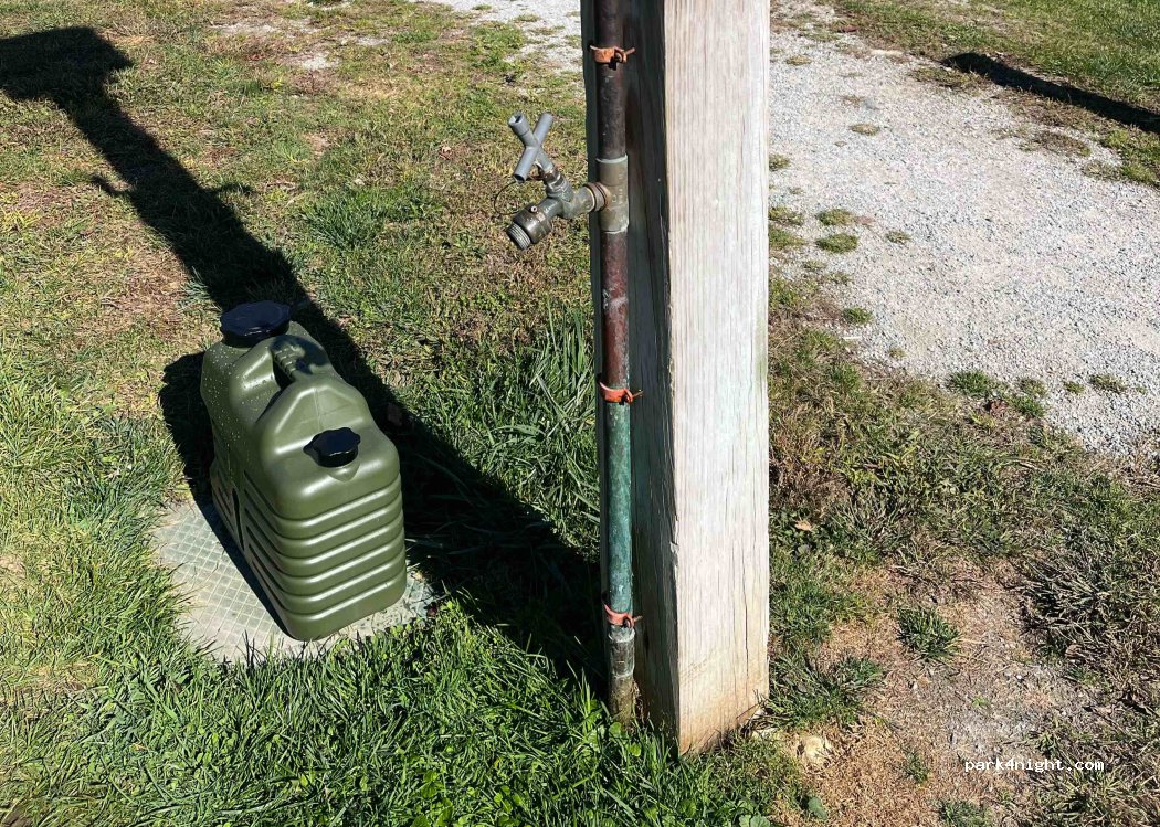 Acqua potabile facile da caricare, munitevi di pinza. Parcheggio vicinissimo all’ imbarco acqua.Dentro al complesso sportivo vicino al parco per cani.