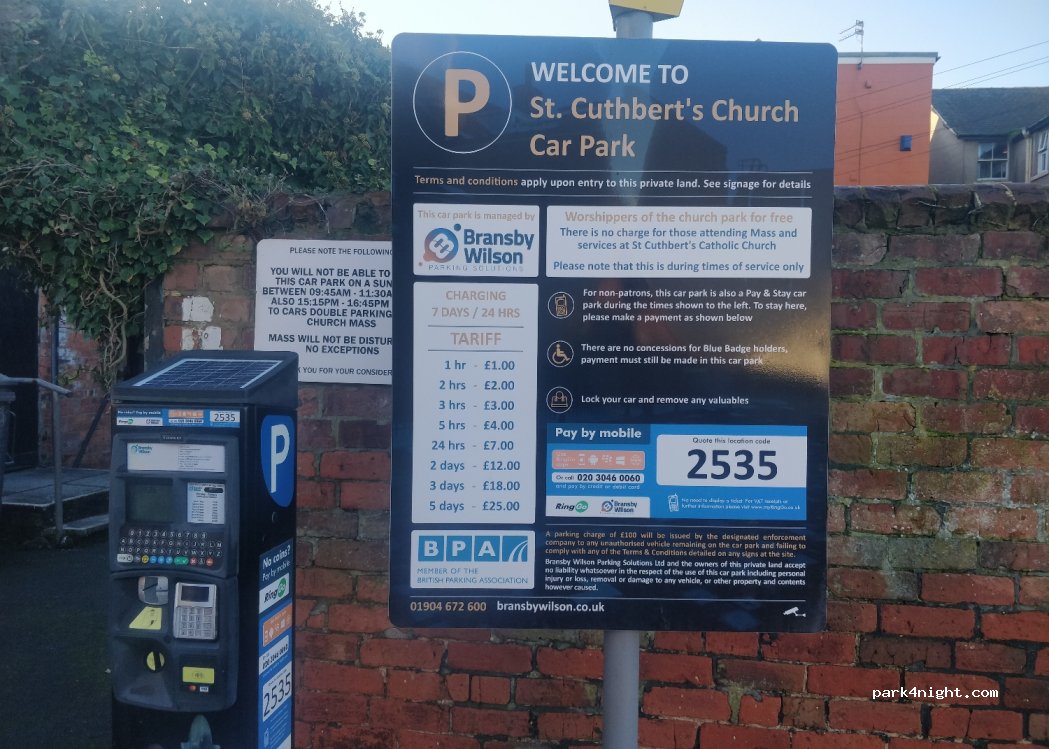 Parkplatz der St. Cuthbert's Church. 7 £ pro Tag oder 25 £ für 5 Tage. Wir haben für 5 Tage gebucht. (Buchung per App oder Automat) Ruhige Nacht letzte Nacht, obwohl der Fußball lief, war noch viel Platz. Für große Wohnmobile nicht wirklich geeignet. Der Eingang befindet sich in der Lytham Road, neben dem Excelsior Pub.