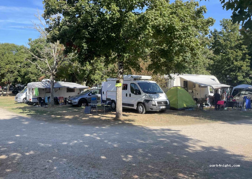 Camping con amplias parcelas y mucha sombra. Gran piscina. A un paseo del pueblo. Tranquilo a mitad de junio. 22€ con electricidad 2 personas camping-car.