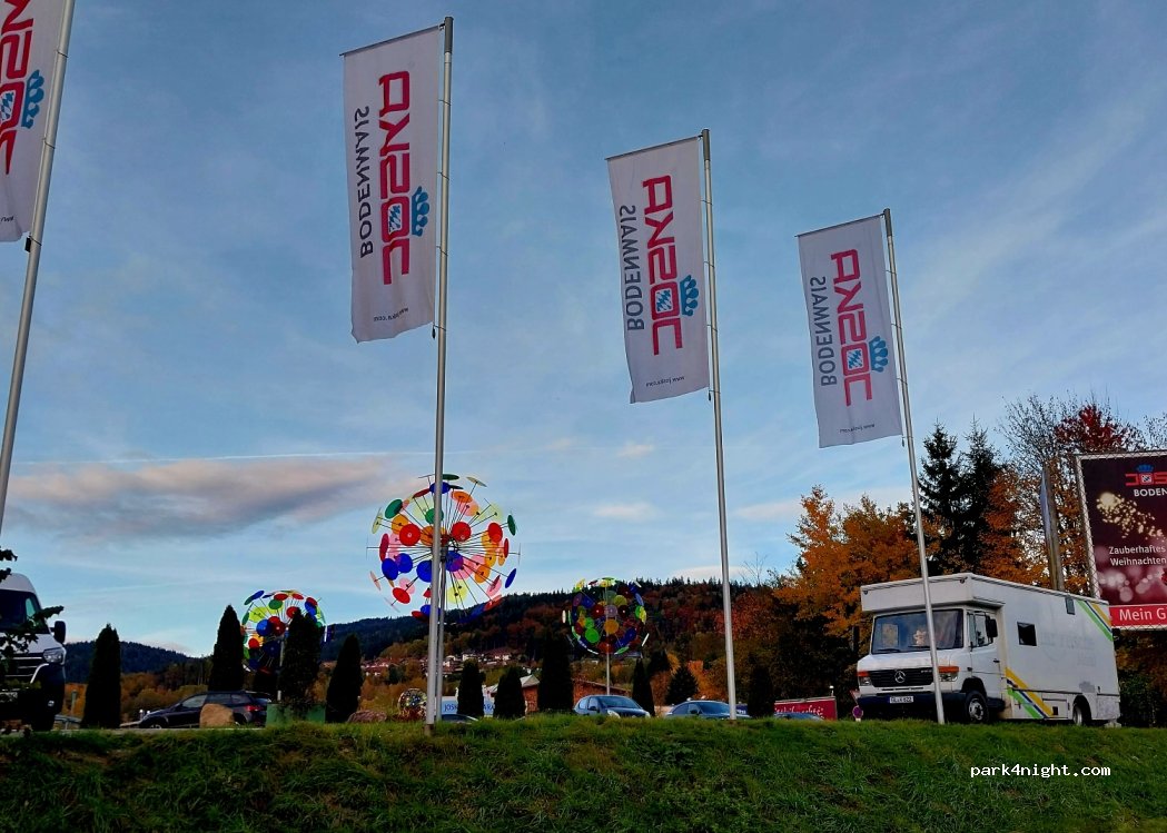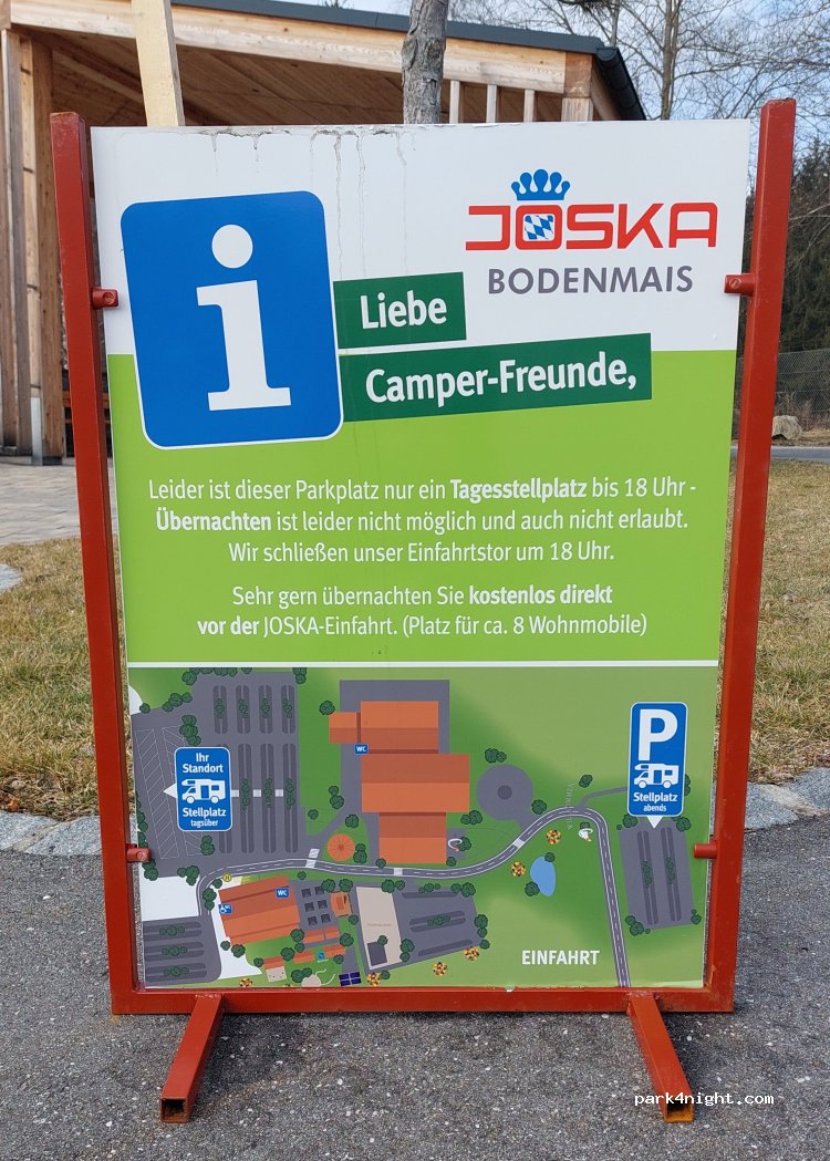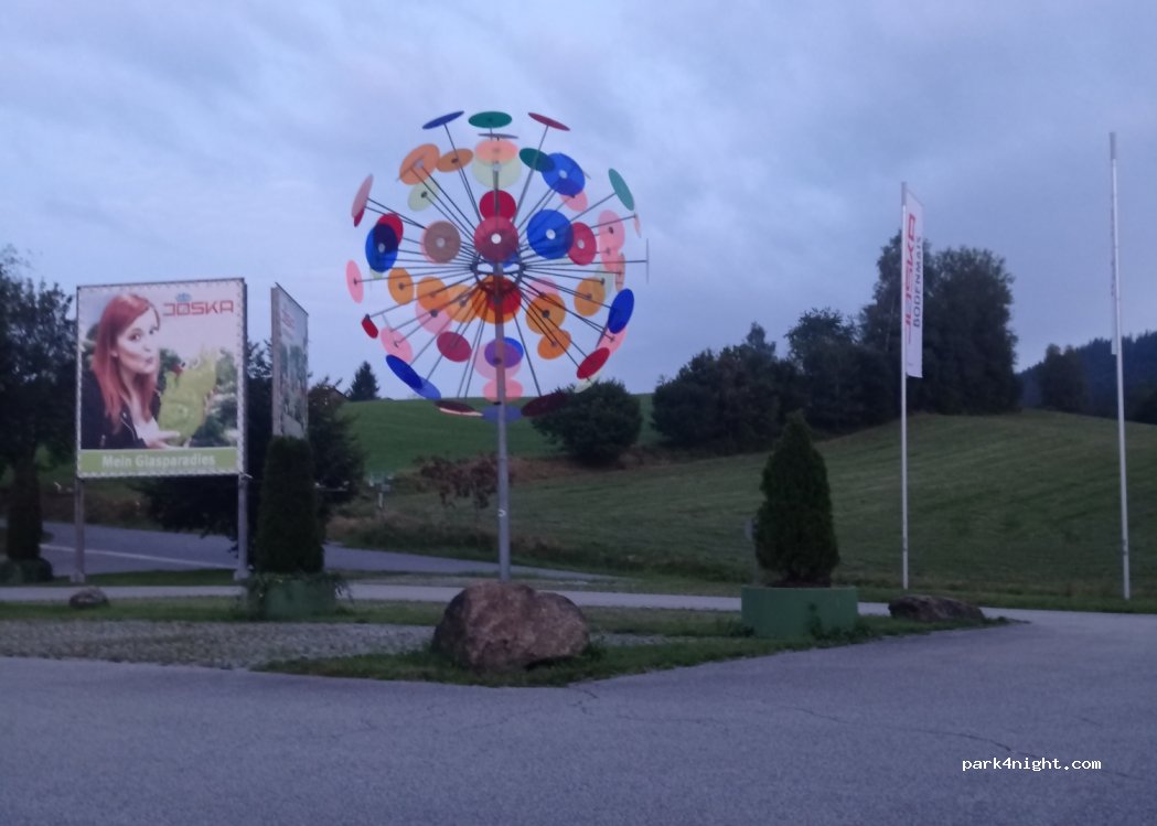 Parkplatz der Glasbläserei Joska. Das Parken auf dem Parkplatz innerhalb des Glasbläsergeländes ist nur während der Öffnungszeiten gestattet.