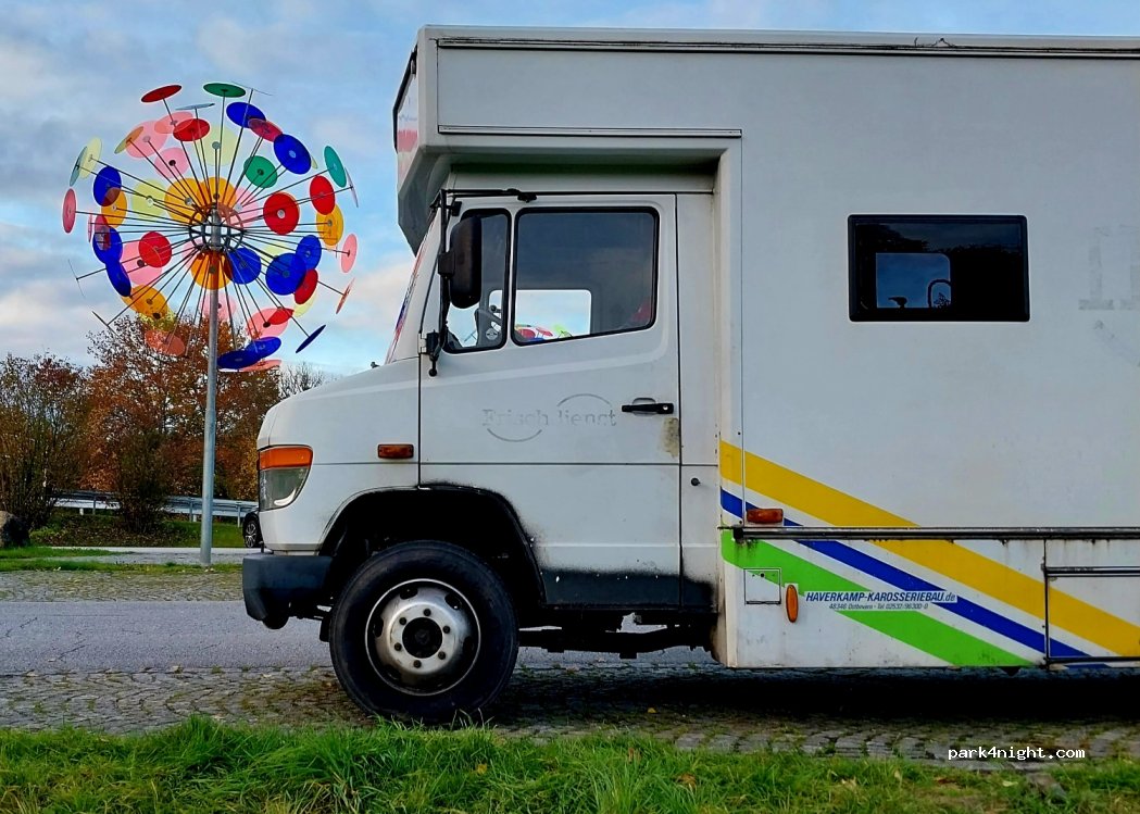 Stellplätze zum Übernachten außerhalb des Geländes, neben der Einfahrt. Man steht leicht schräg. Straßenverkehr der B 85 war kaum hörbar, hat uns nicht weiter gestört.