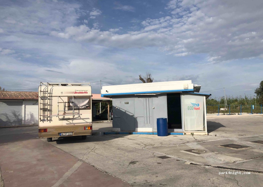 Robinet derrière un bâtiment séparé de la station-service. Demandez simplement gentiment. PAS D'EAU POTABLE. La station-service est également super sympa, avec un service de ravitaillement et également bon marché. Bonne pression d'eau. Raccord à vis pas complètement serré car un peu vieux et probablement calcifié. Beaucoup d'espace.