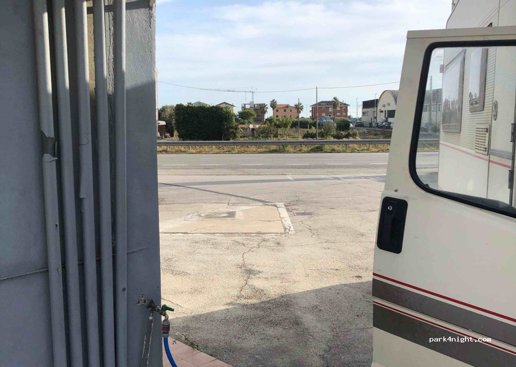 Faucet behind separate gas station building. Just ask nicely. NO DRINKING WATER. Gas station is also super friendly, with refueling service and also cheap. Good water pressure. Screw connection not completely tight as it is a bit old and probably calcified. Lots of space.