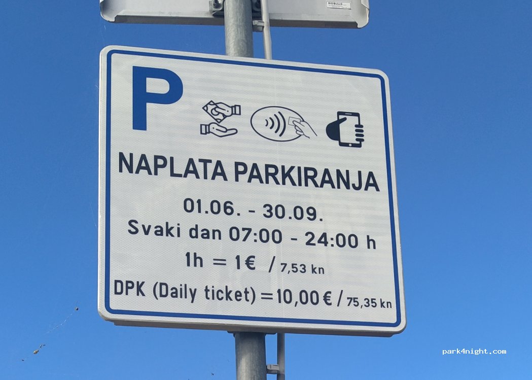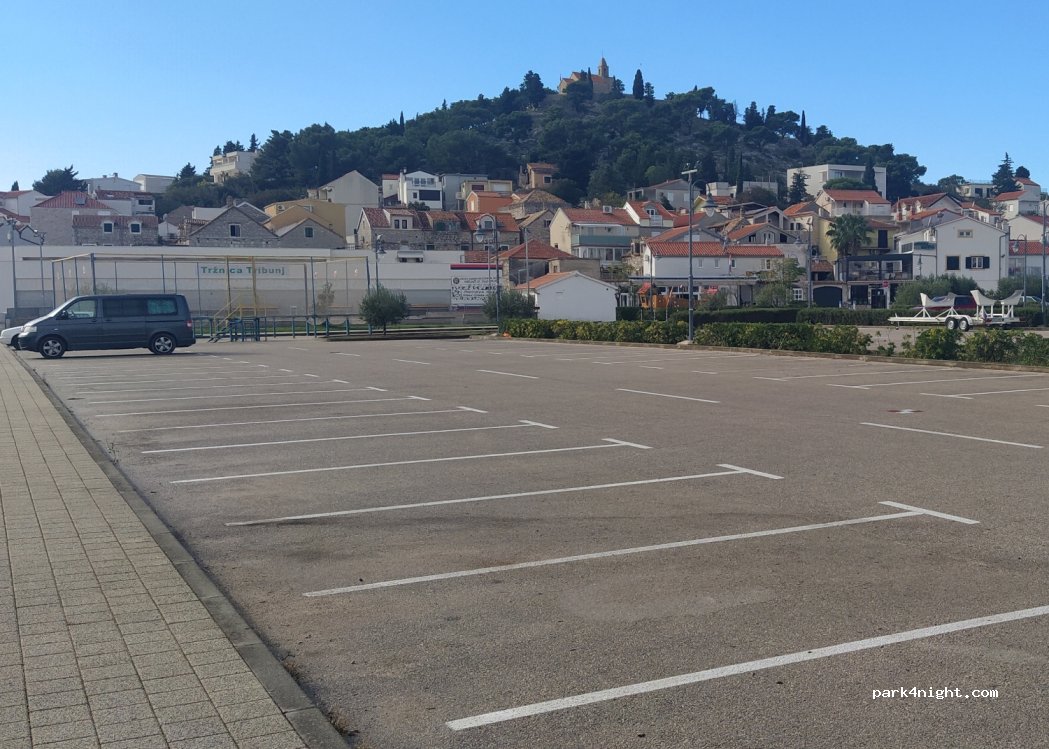 Grand parking principal du village de Tribunj. Payant en haute saison, gratuit du 01/10 au 31/05. Petit supermarché et boulangerie sur la place. Aire de jeux pour enfants. Accès au village, restaurants, plages à proximité.