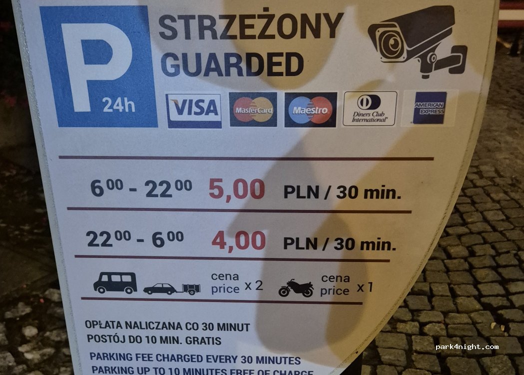Fajny niewielki parking płacisz za godzinę wiec nie ma problemu. Trochę jest z górki wiec auto mocno pochylone ale na jedną noc spoko. Cena 5 PLN za godzinę.