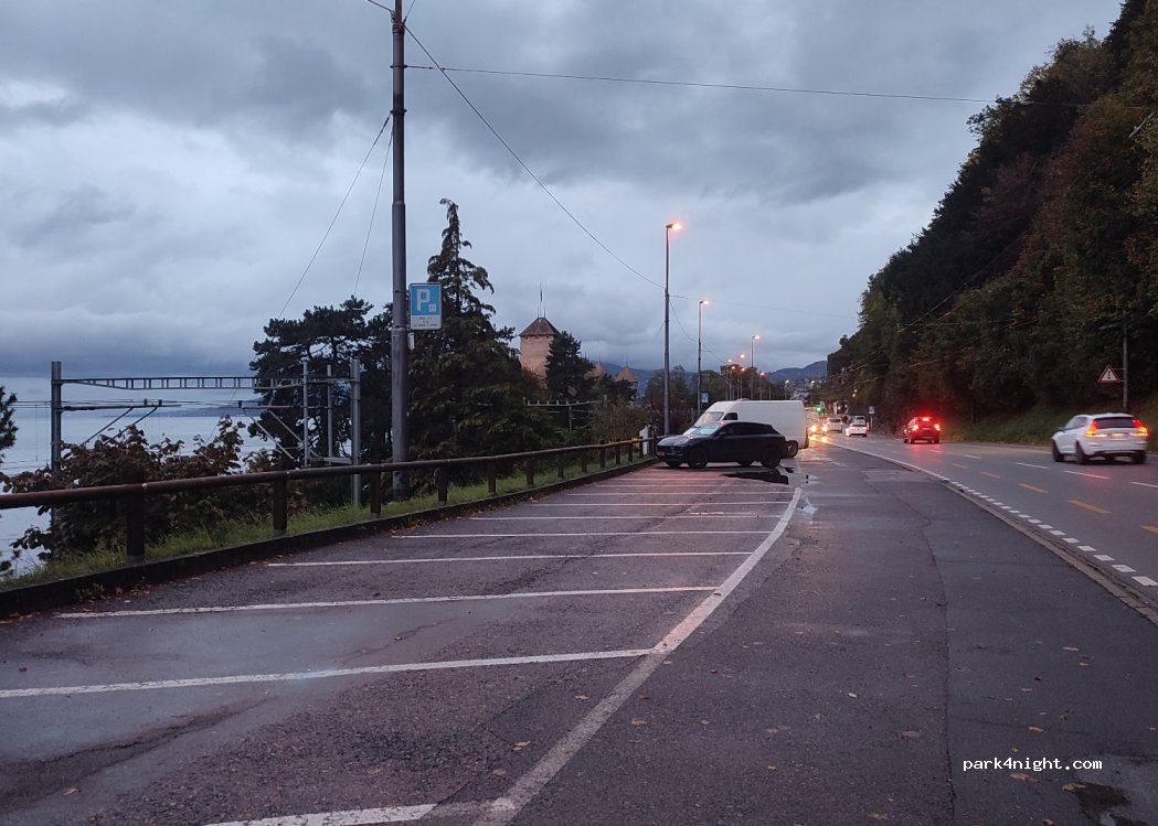 Parking gratuit pour visiter le château de Chillon, maximum 3h (08h00-20h00 tous les jours) avec le disque bleu. Il y a beaucoup d'endroits pour se garer mais tous ne sont pas assez grands pour les camping-cars. Le château est à environ 10 minutes à pied. Je ne sais pas si vous pouvez rester pour la nuit mais c'est une rue très fréquentée.