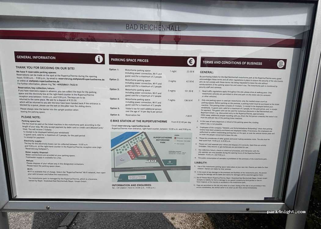 Buona area sosta, prezzo un po' sopra la media, 19,60€ per 24h. Richiedere chiave della cassetta elettricità al benzinaio vicino, cauzione 20,00€. Cittadina di Bad reichnall carina, merita una visita.