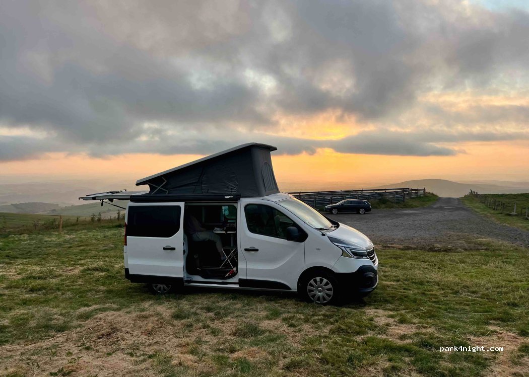 Magnifique vue, très belles couleurs au lever du soleil. La route est étroite mais bien goudronnée, avec un van, nous n’avons eu aucun souci. Il s’agit d’un point de départ de rando vers le Puy Violent donc assez fréquenté en journée, mais nuit très calme. Terrain légèrement en pente. On recommande ++