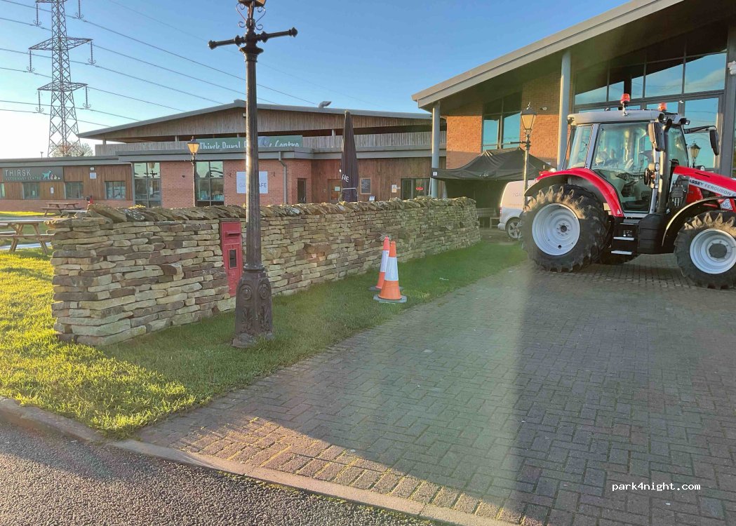 Thirsk Auction Mart. Stecken Sie das Geld in einen Umschlag mit einem Vermerk der Registrierungsnummer in den alten roten Briefkasten an der Wand. Sehr gutes Café, geöffnet von 8 bis 14 Uhr. Der Parkplatz wird von Lastwagen genutzt, daher ist es nicht sehr ruhig, aber wir haben gut geschlafen.