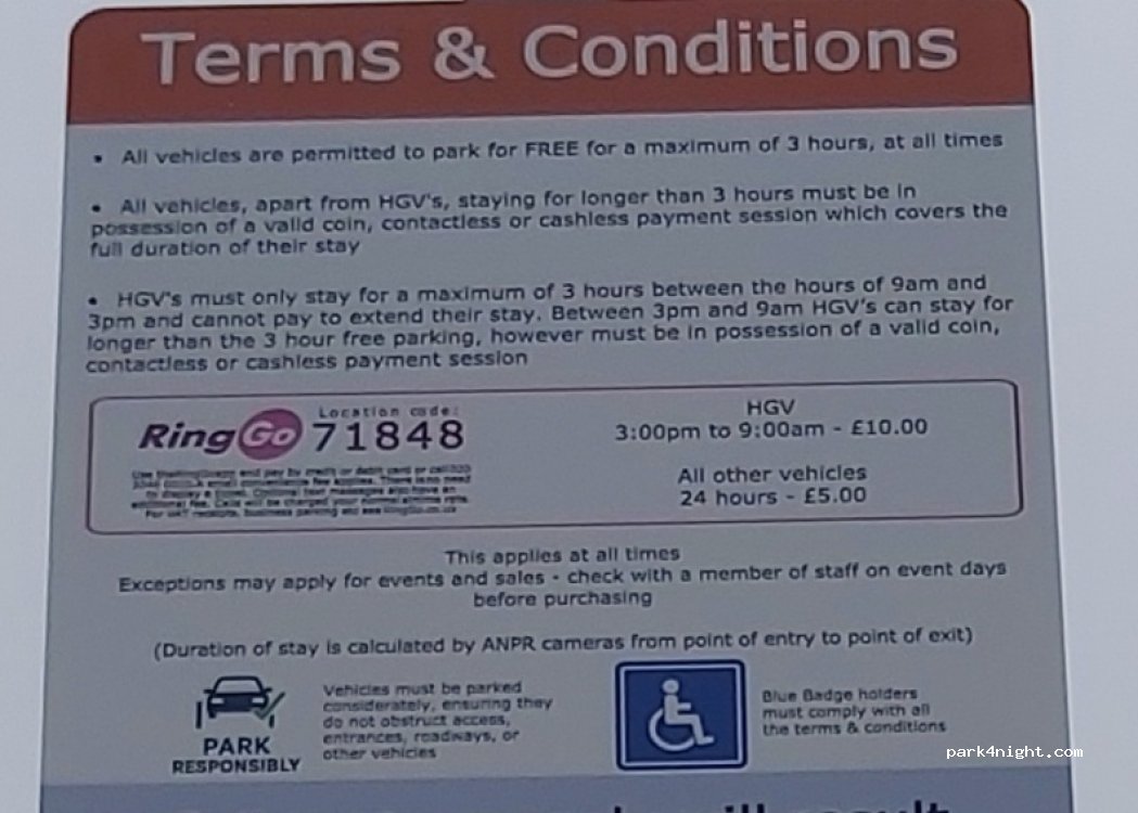 Overnighted last night, put money in envelope in post box , however payments now changed signs going up today charges will still be £5 for overnight, but either app/card/coin payment, well worth every penny, lovely flat parking area, lorrys park up around 7/9pm but lit area and silence. Easy entrance and exit, and a cafe on site. With an all animal (dogs/cats/birds/food shop & vets.