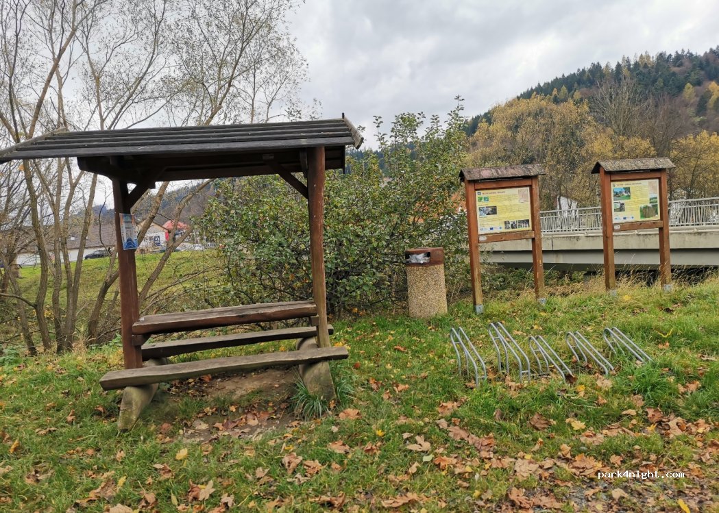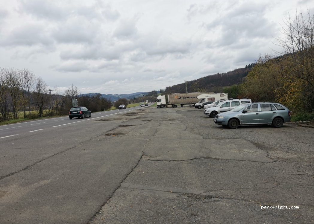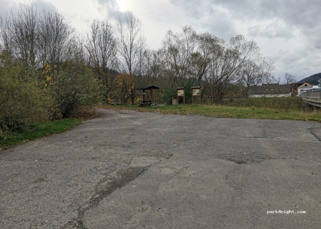 Parking lot next to the road where trucks are staying. Quite noisy, but possible for sleeping. It is next to the path for bikers next to the river. Good for dog owners.
