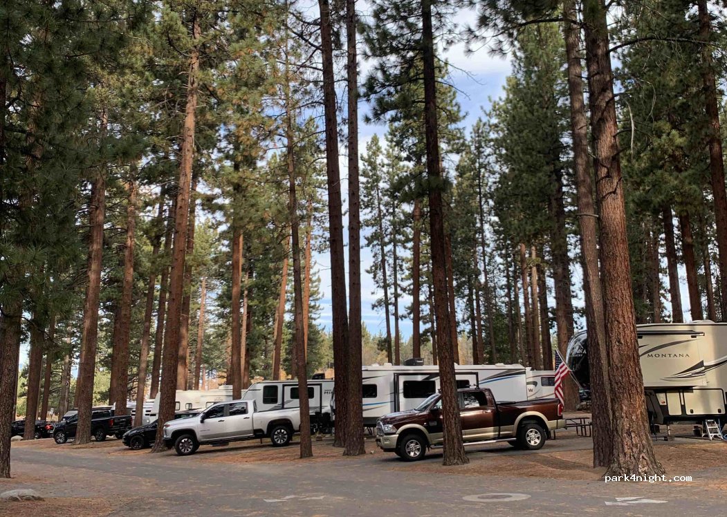 Camping abierto todo el año (práctico fuera de temporada) a dos pasos del lago Tahoe. Las duchas, amplias y calientes, y los sanitarios están climatizados. Muy buen restaurante al otro lado de la carretera. Cada lugar tiene acceso a agua, electricidad, una mesa de picnic, una fogata y, a veces, una caja para osos.