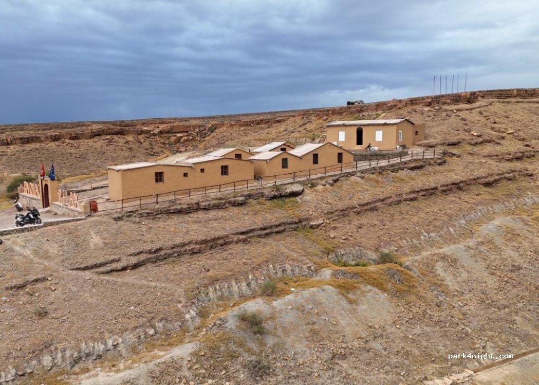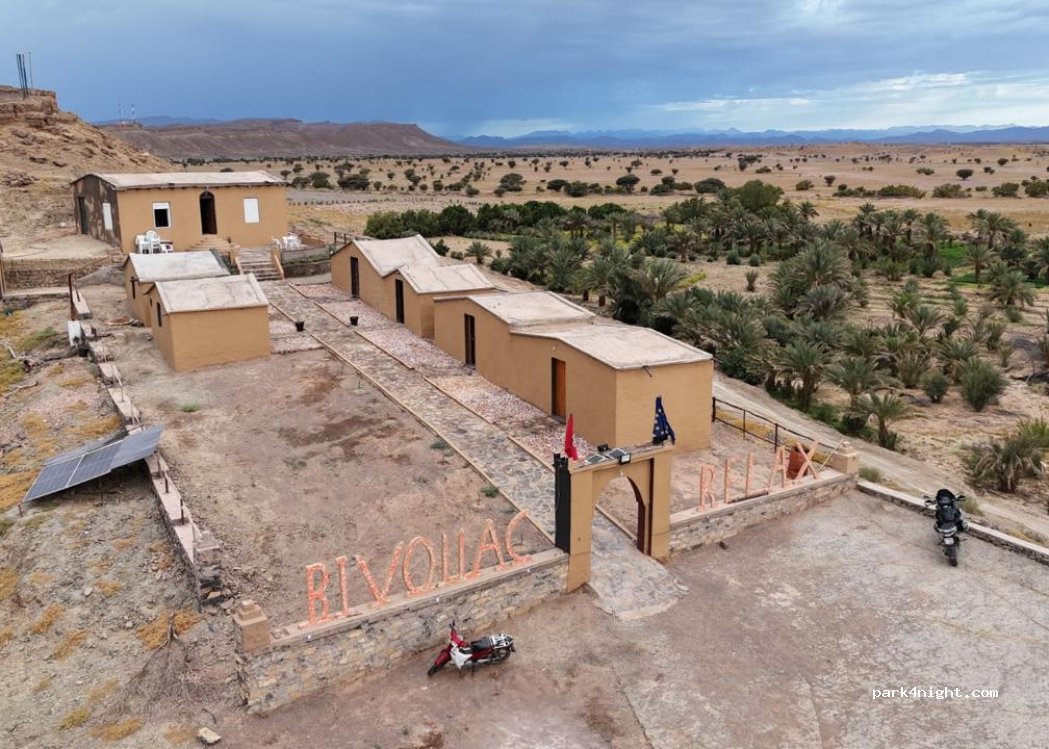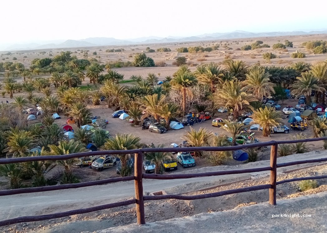 Wir haben eine Nacht verbracht. Es ist ein Restaurant bei dem man kostenlos auf dem Palmen bewachsenen Parkplatz stehen kann, wenn man dort isst. Tajine 10 Euro pro Person. Es muss einem bewusst sein, das es kein Campingplatz ist! Man kann beim Restaurant. das Bad benutzen also klo und Dusche. Es dauert 5- 10 min bis das Wasser warm wird. Das essen war sehr lecker. es gab frischen Tee u.Nüsse