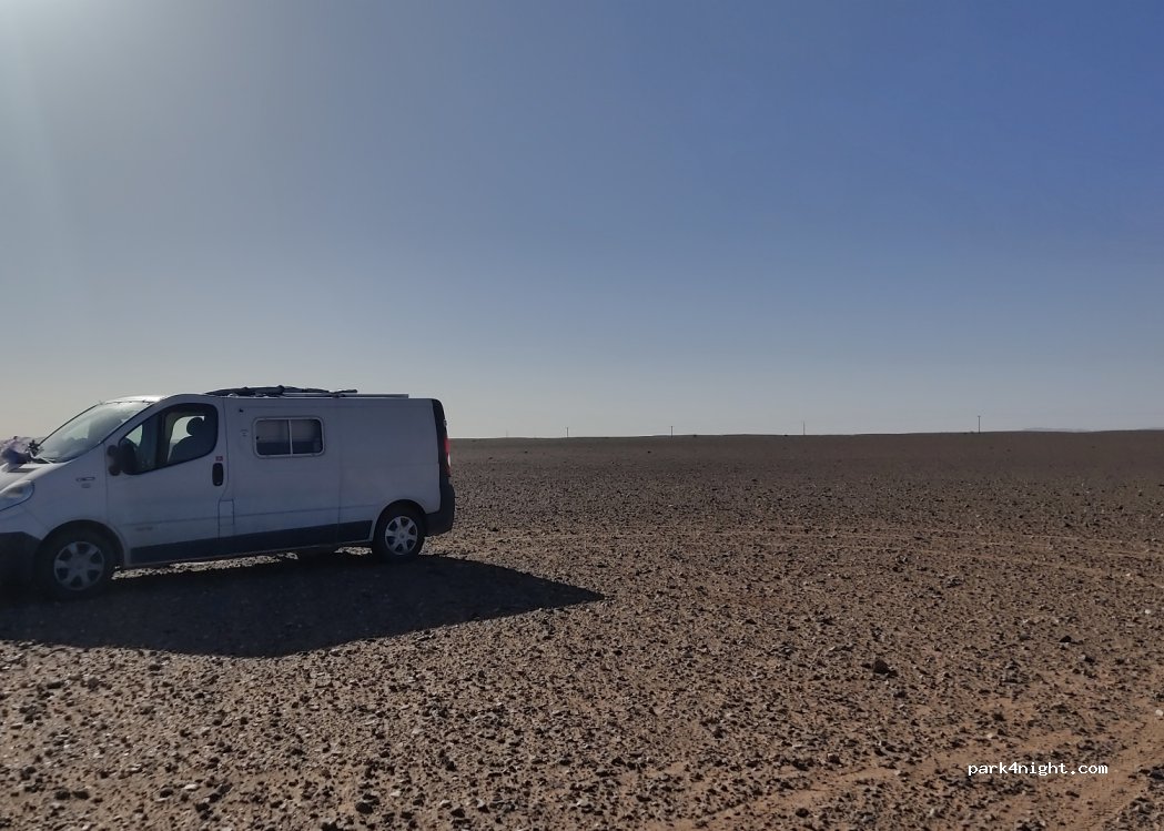 At the edge of the Merzouga road, vast space, accessible hard ground. View of the dunes and sunset. Very quiet at night, network coverage.