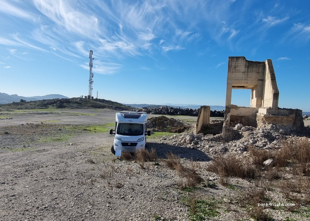 Large esplanade right between the antenna and an abandoned building. There is good 4G reception. Pretty quiet night. We parked right next to the building since we were a little more hidden from potential onlookers. At night (9:00pm) we heard a group of people, our dog barked and they immediately left. We felt safe and had a good night. In the morning we only saw a shepherdess with her animals. He greeted us in a friendly manner.