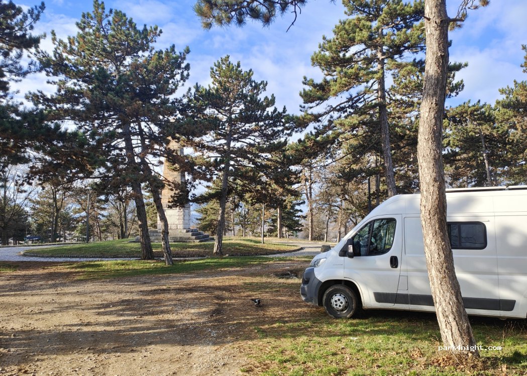 endroit en travaux sur le monument russe + des gens encore attablé à minuit sur aire pique nique heureusement 50 m en contrebas une zone bitumée en pente à permis la nuit...prévoir grosse cale ses chiens errants abois soir et matin ... et bruit de fond autoroute au loin ... mais bon j'ai réussi à bien dormir quand même me suis senti en relative sécurité... ça reste la Serbie...