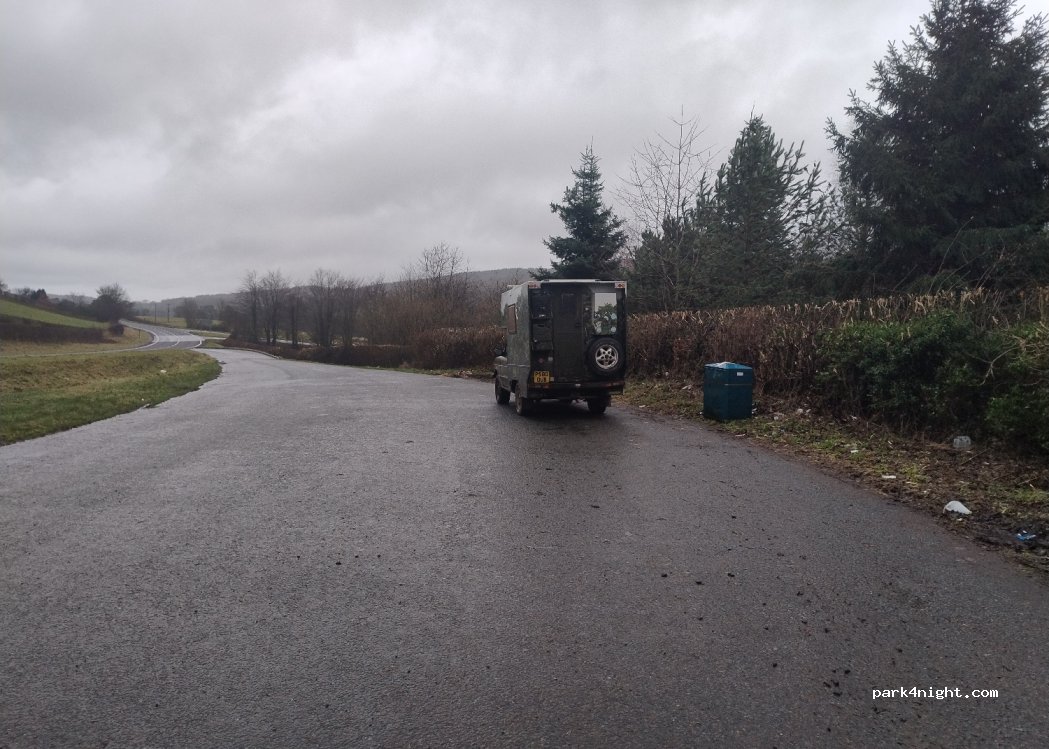 Perfect one night stop over. One other camper and a few passing cars but fairly quiet. Nice and flat. No services but there is a bin. nice large lay by.