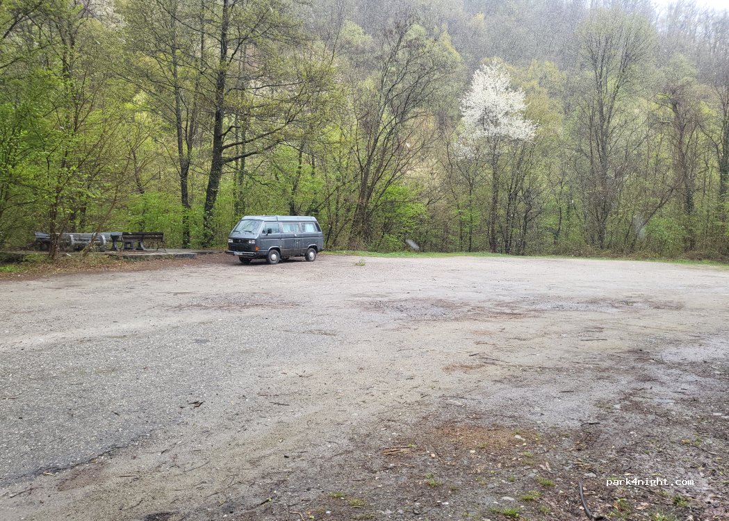 Beau parc de stationnement. Juste à l’entrée du parc national Cozia. Calme malgré la grande route en passant. En avril, nous étions seuls. Aucune station hébergement mais gaz avec WC et wifi seulement 1 km.